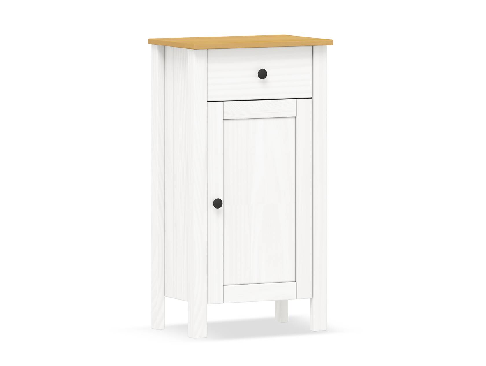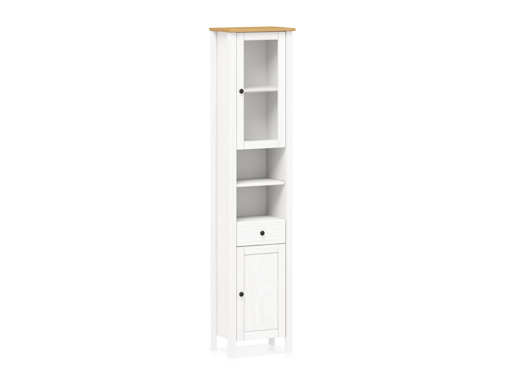 Die warme, braune Kiefernholzausführung verleiht Ihrem Raum eine einladende Atmosphäre, während die schwarzen Metallgriffe einen modernen Akzent setzen. Mit zwei Türen, hinter denen sich jeweils ein stabiler Ablageboden verbirgt, bietet dieser Hochschrank ausreichend Platz für Handtücher, Pflegeprodukte und mehr.