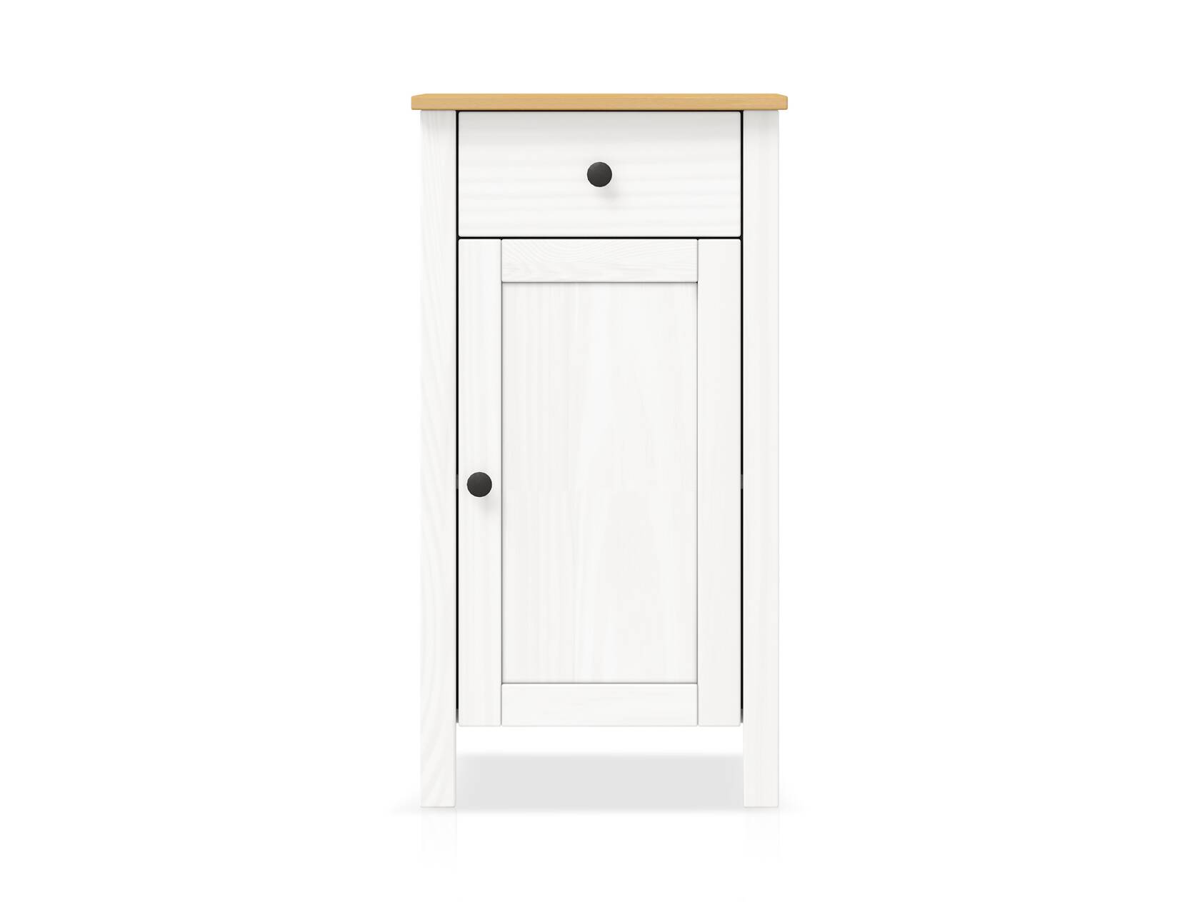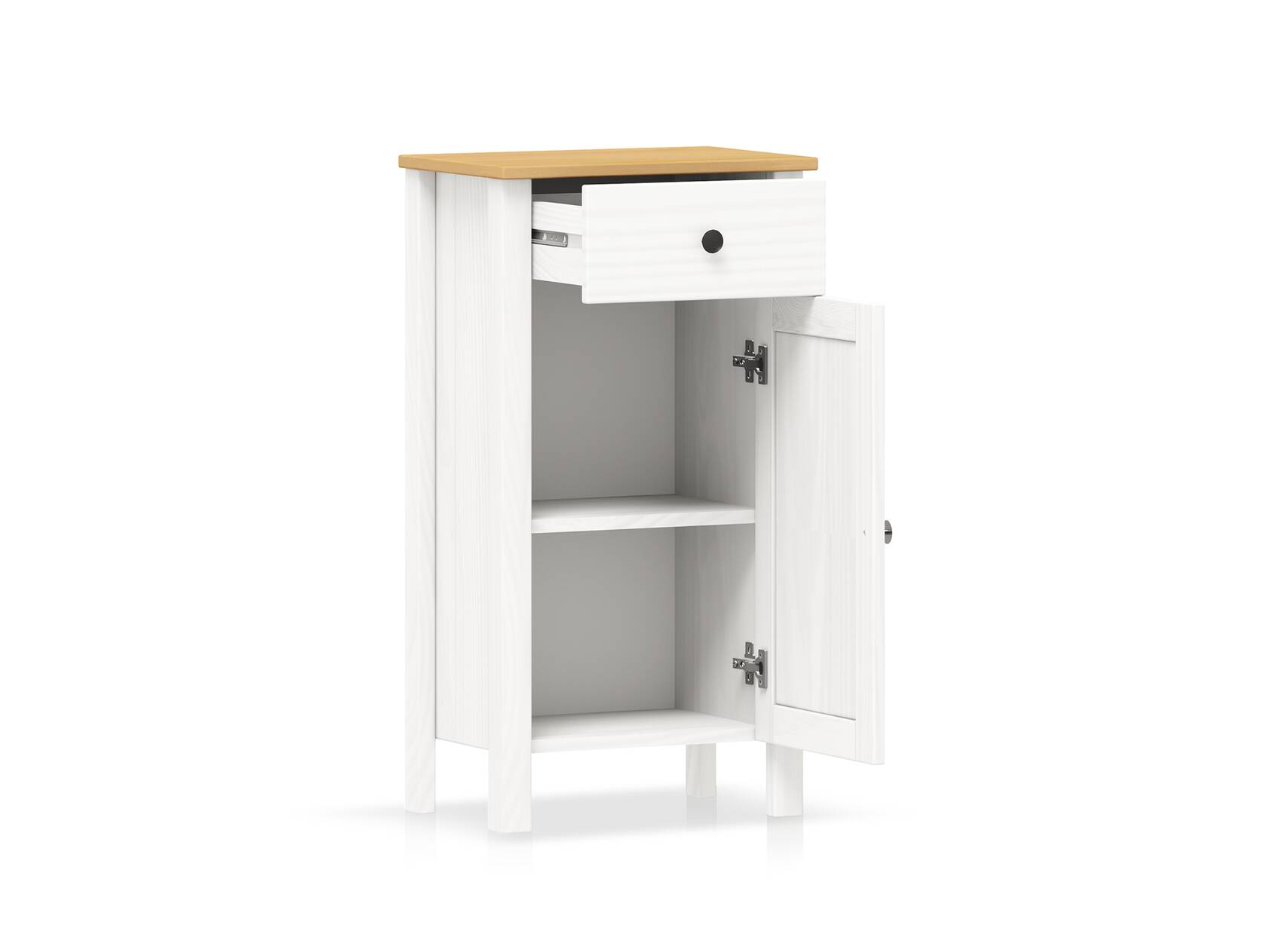 Hergestellt aus hochwertigem Kiefernholz, strahlt diese Kommode natürliche Wärme und Eleganz aus. Die klaren Linien und die schlichte Form fügen sich harmonisch in jede Badezimmereinrichtung ein und setzen gleichzeitig stilvolle Akzente. Die schwarzen Metallgriffe verleihen der Kommode einen modernen Touch und sorgen für eine angenehme Handhabung.