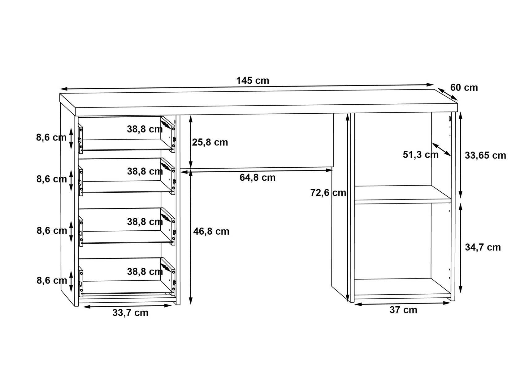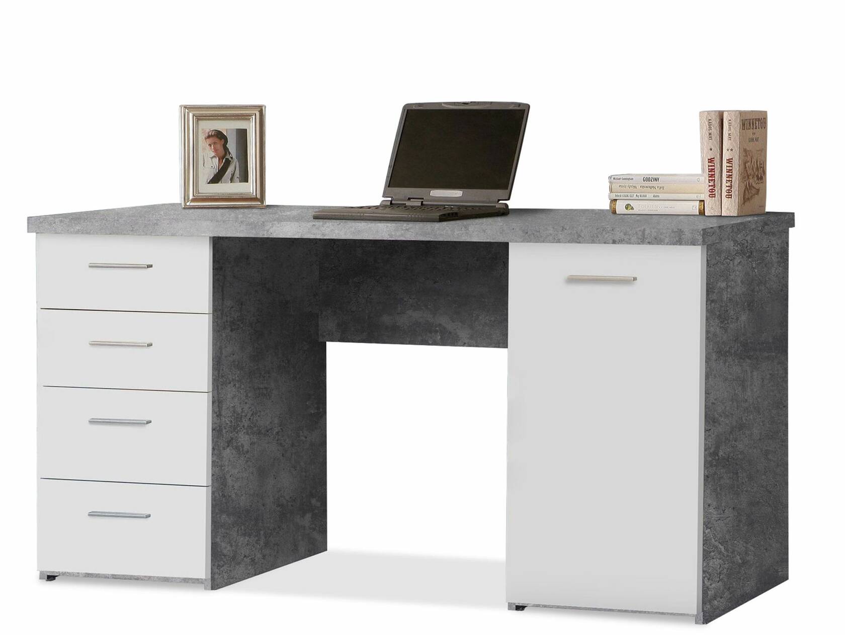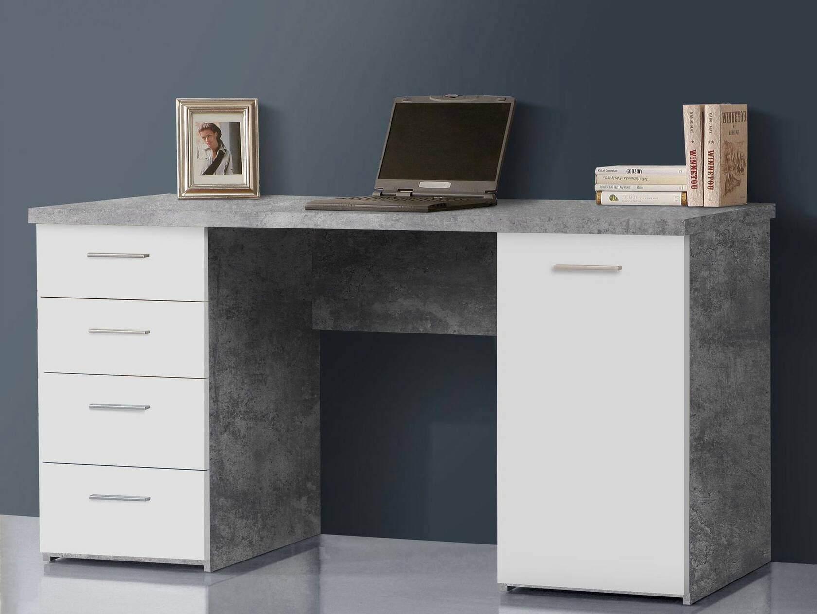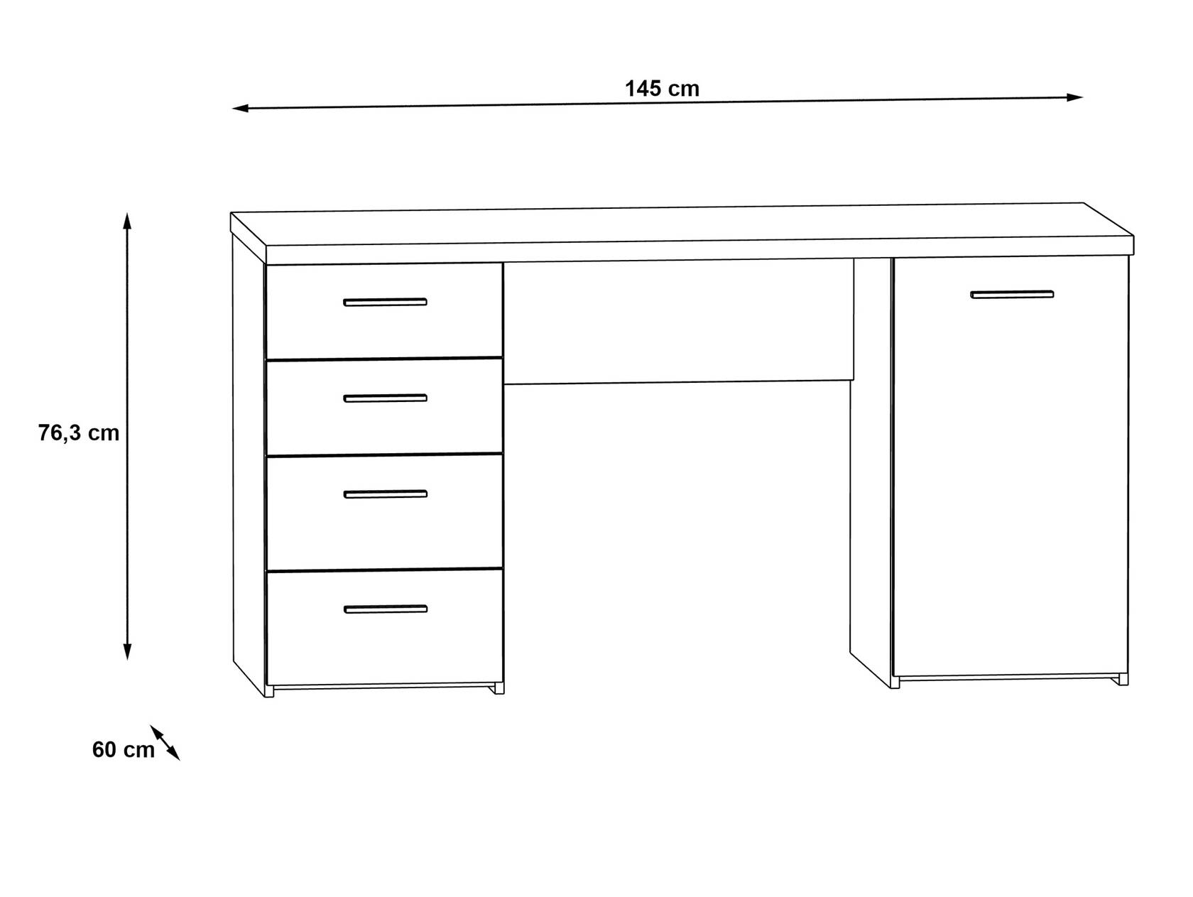 Auf der Arbeitsfläche können Sie Ihre Schreibutensilien und Ihren Computer optimal platzieren. Auf der linken Seite befinden sich vier Schubkästen und auf der rechten Seite befindet sich eine Tür. Diese Aufteilung bietet Ihnen ausreichend Stauraum, um Ihre Dokumente und Unterlagen sicher aufzubewahren.