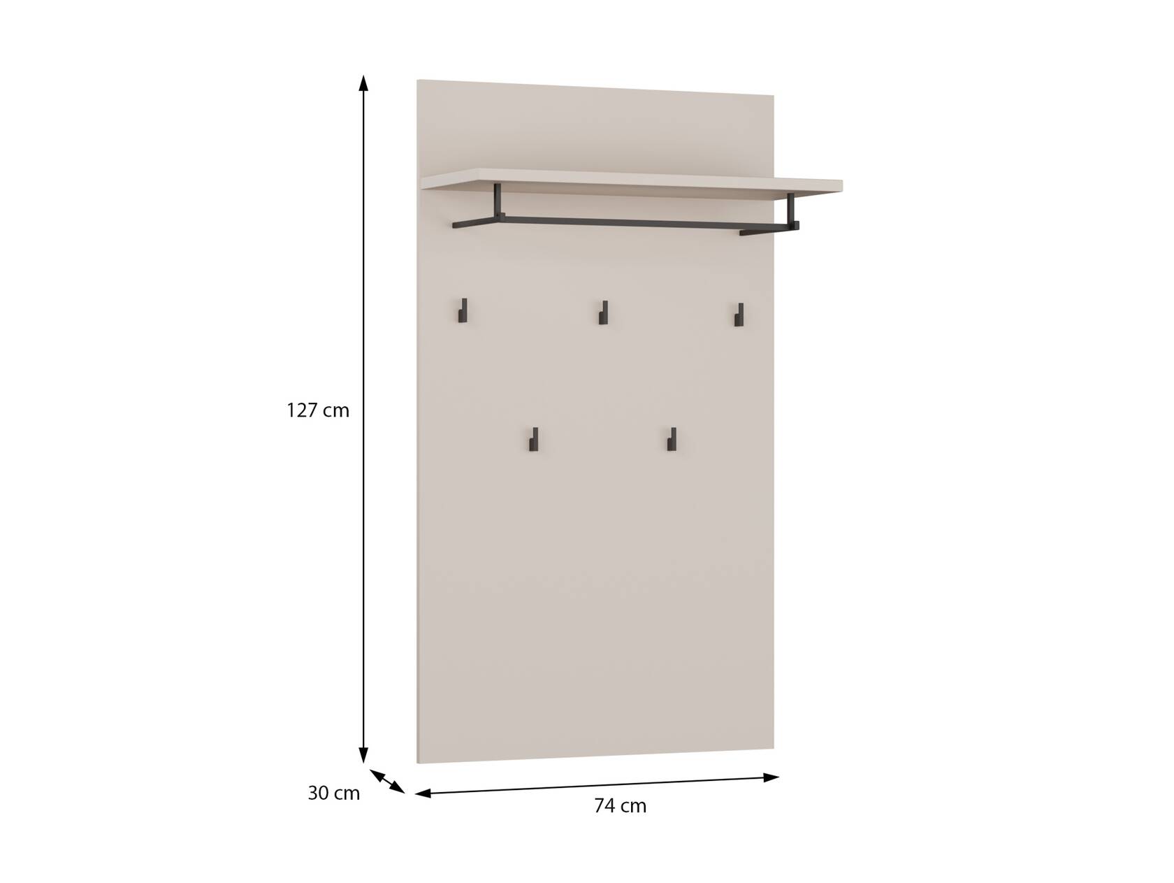 | Wandgarderobe: | Breite: 74 cm, Höhe: 127 cm, Tiefe: 30 cm |