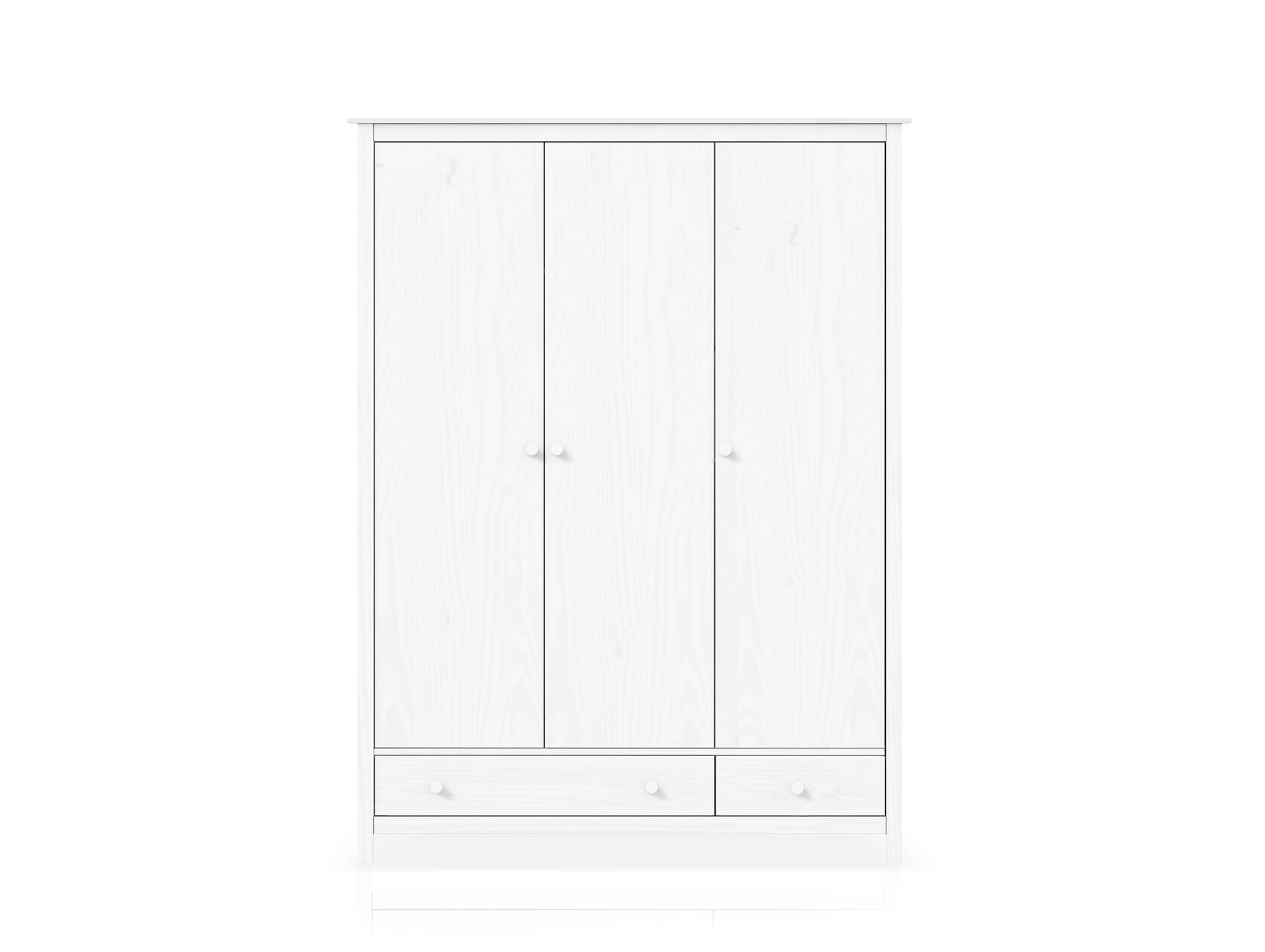 Das durchdachte Design präsentiert sich mit Schubkästen auf Metallschienen und Drehtüren für einen einfachen Zugang. Im Inneren des Schrankes bieten 3 Drehtüren Zugang zu 2 Abteilen – links mit 1 Boden und 1 Kleiderstange sowie rechts mit 3 Böden. Zudem bietet der Schrank eine praktische Aufbewahrungslösung durch 1 großen Schubkasten links und 1 kleinen Schubkasten rechts.