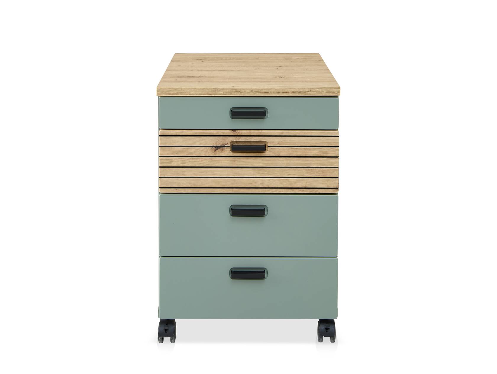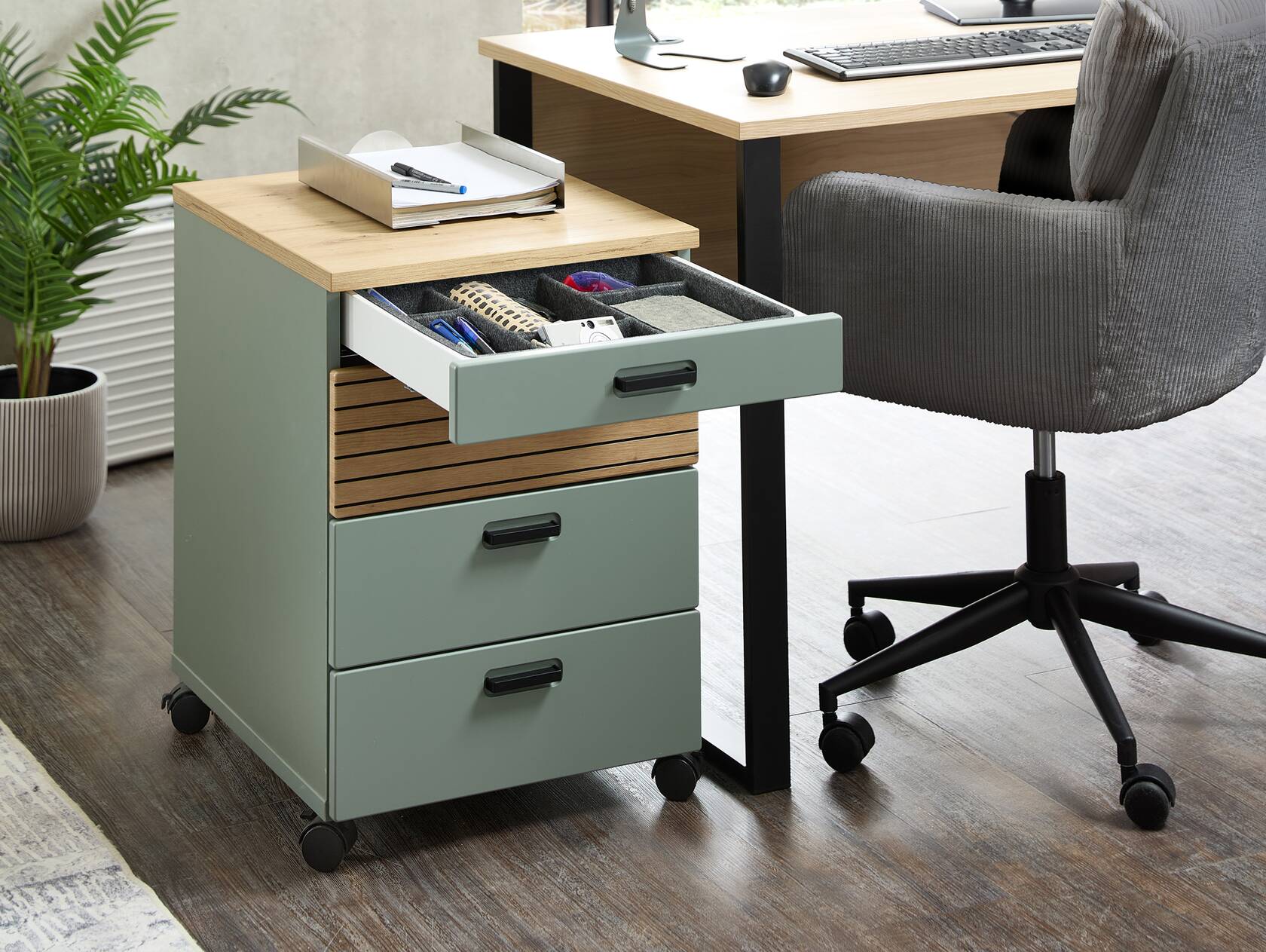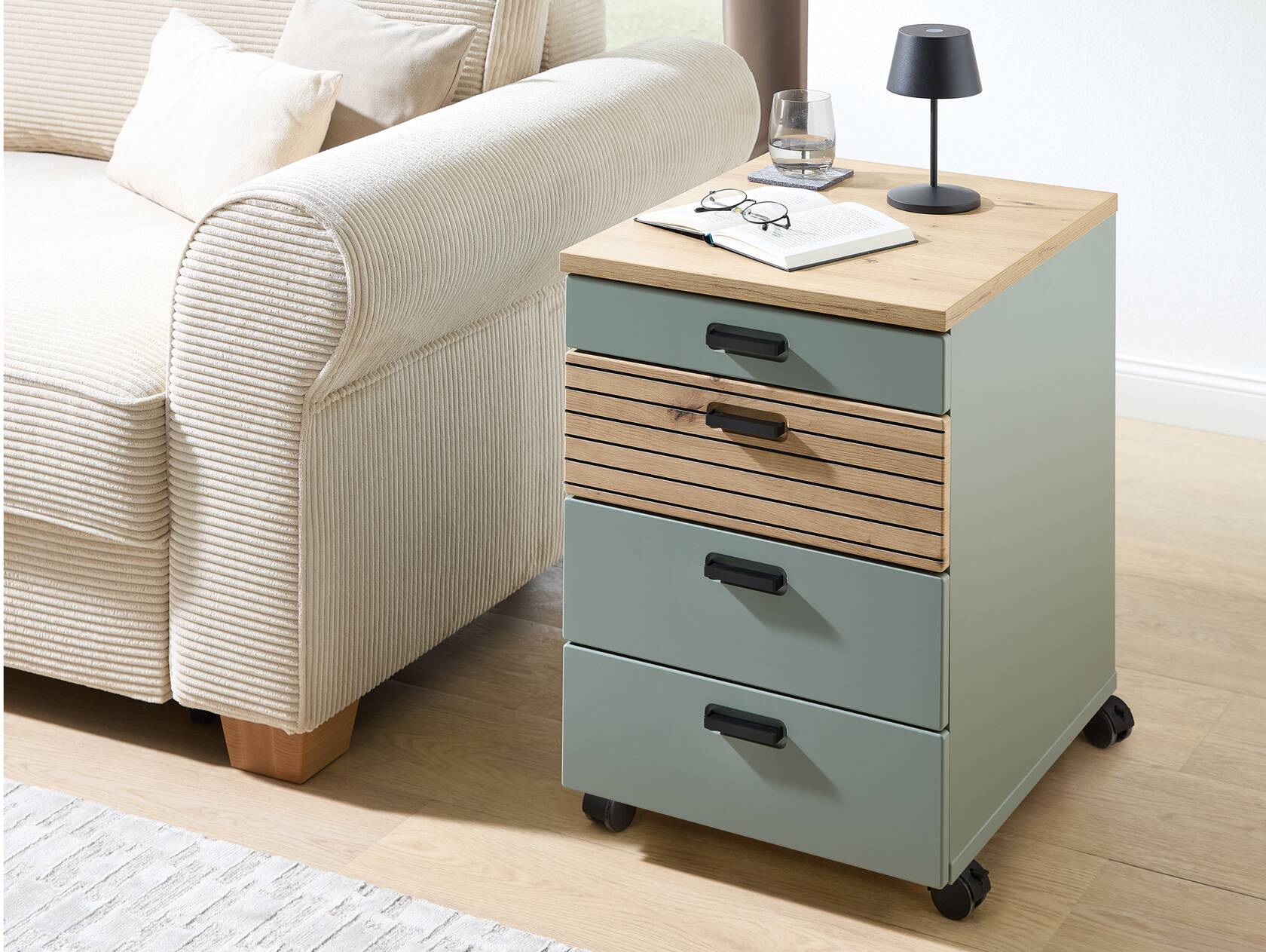 Der GENNY Rollcontainer ist der perfekte Begleiter für modernes Wohnen und bringt Ordnung in Ihr Zuhause. Mit seinem eleganten Design in Eiche und den mattschwarzen Griffen fügt er sich harmonisch in jedes Ambiente ein und setzt gleichzeitig stilvolle Akzente.