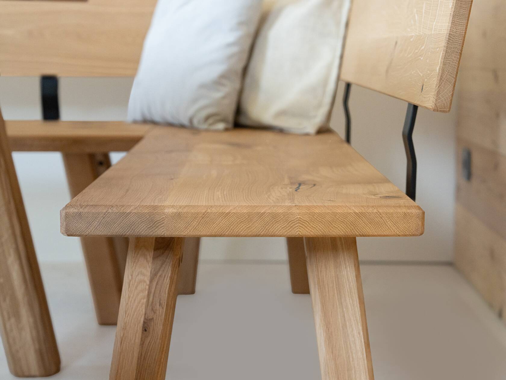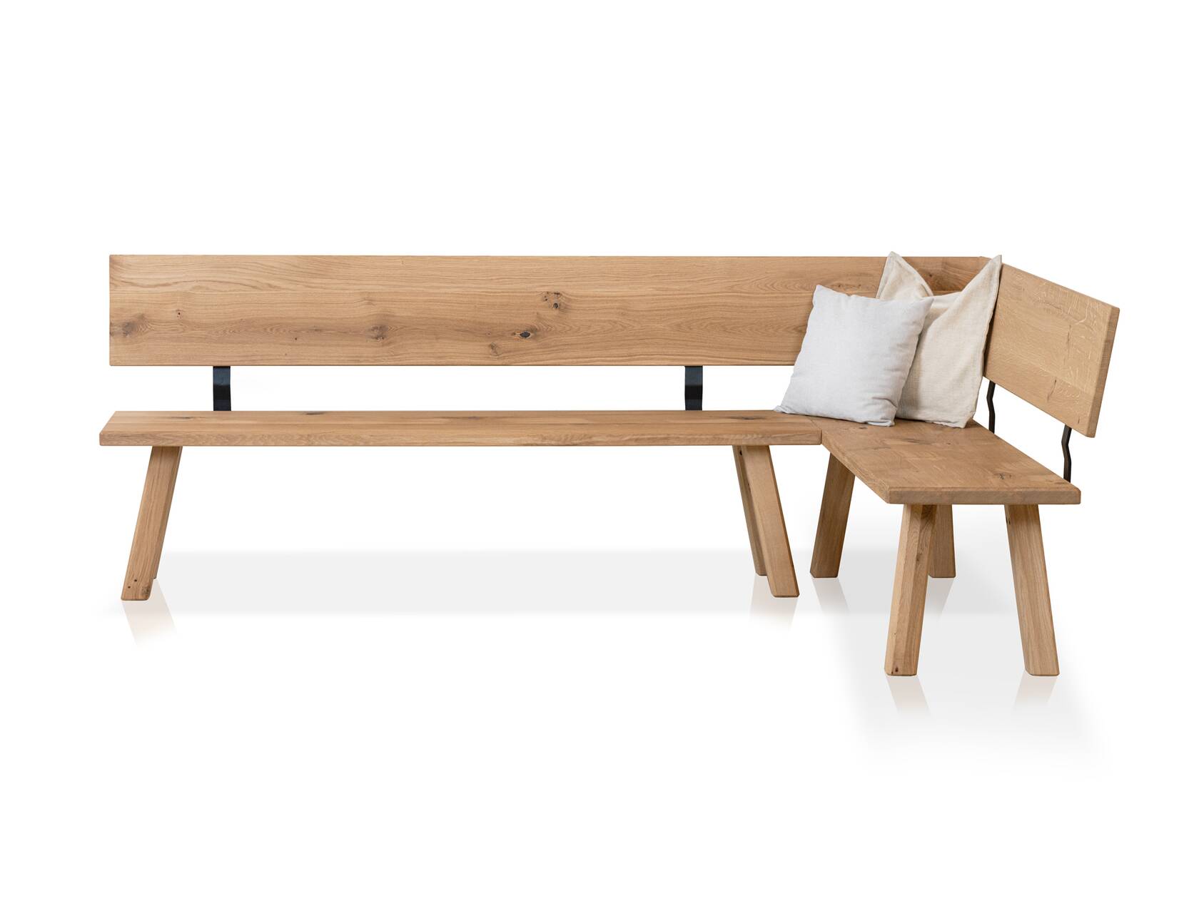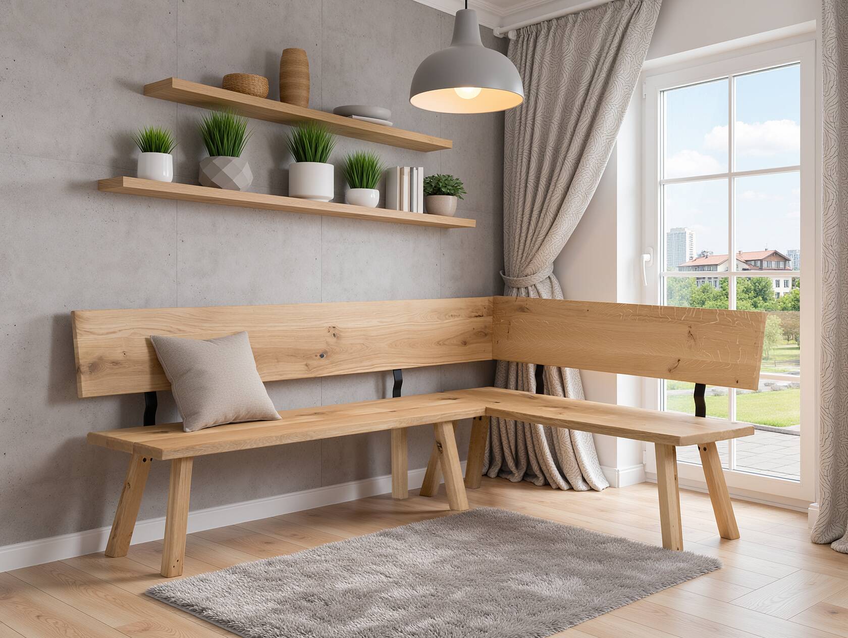 Hergestellt in Deutschland und aus eigener Produktion, garantiert die BERGSEE Eckbank höchste Qualität und Langlebigkeit. Die sorgfältige Verarbeitung und die robusten Materialien machen sie zu einem unverzichtbaren Bestandteil Ihrer Einrichtung. Die schwarz lackierten Halterungen der Rückenlehne setzen einen modernen Akzent und harmonieren perfekt mit dem natürlichen Holz.