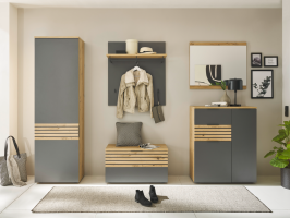 Die Griffe der Vitrine sind in Anthrazit gehalten und passen perfekt zur Gesamtoptik des Möbelstücks. Die Vitrine ist mit zwei Glastüren ausgestattet. Hinter diesen befinden sich insgesamt vier Böden- zwei Holzböden und zwei Glasböden. Diese bieten ausreichend Platz, um diverse Gegenstände wie beispielsweise Geschirr oder Deko- Objekte zu präsentieren.
