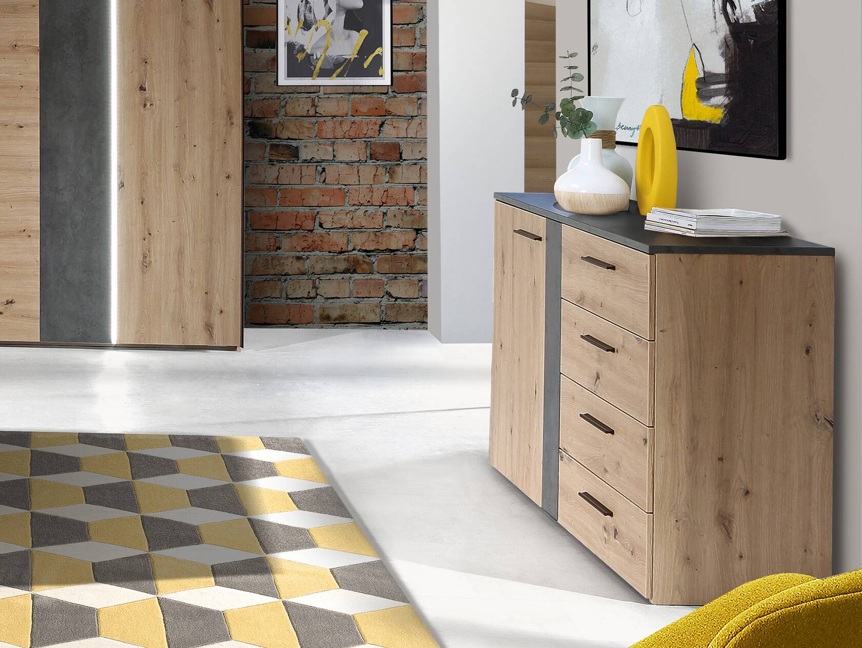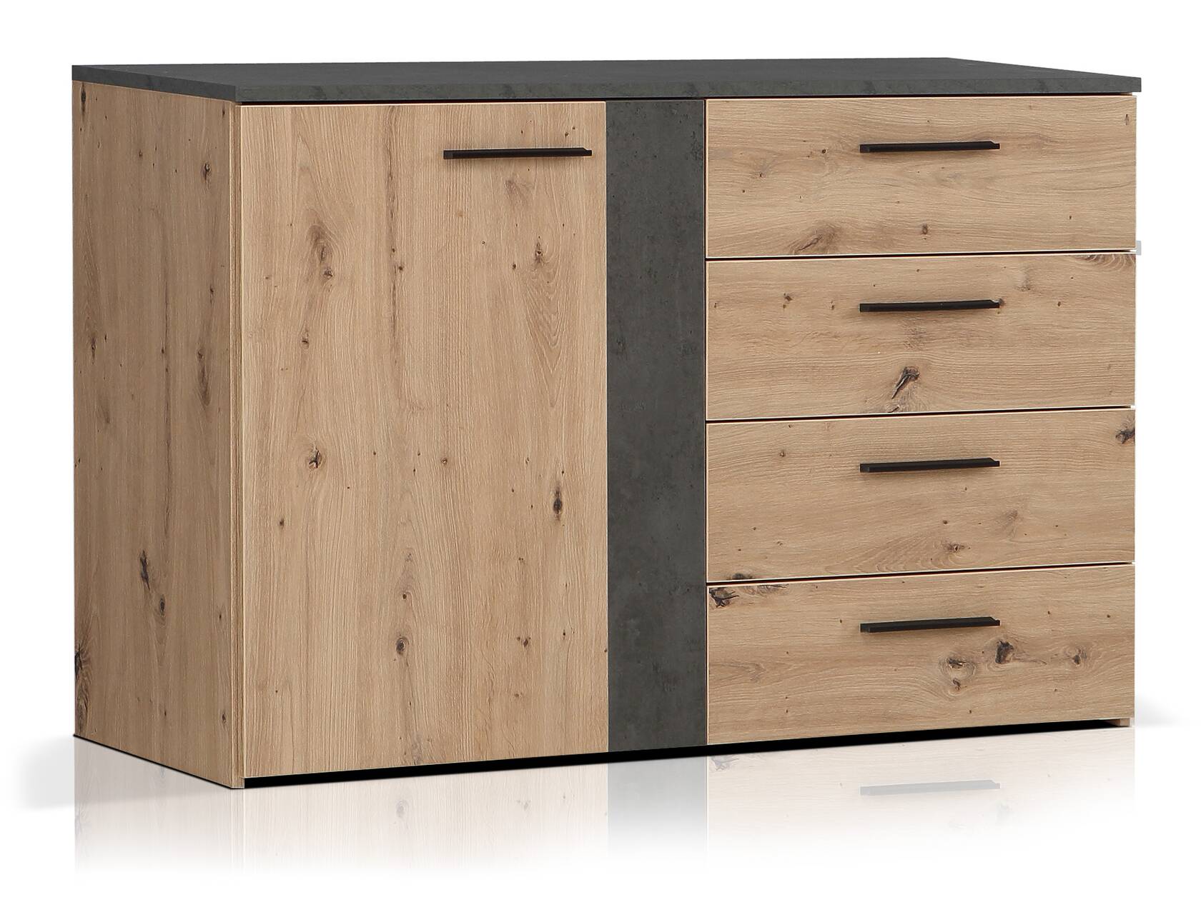 Die FILENA Kommode vereint modernes Design mit praktischer Funktionalität und wird sie Ihr Schlafzimmer mit einem Hauch von Stil aufpeppen. Hergestellt aus hochwertiger Dekorspanplatte bietet sie eine langlebige Konstruktion, die Ihnen lange Freude bereiten wird. Mit ihrer Kombination aus Artisan Eiche Nachbildung und Betonoptik Dunkelgrau fügt sich die Kommode harmonisch in verschiedenste Einrichtungsstile ein.