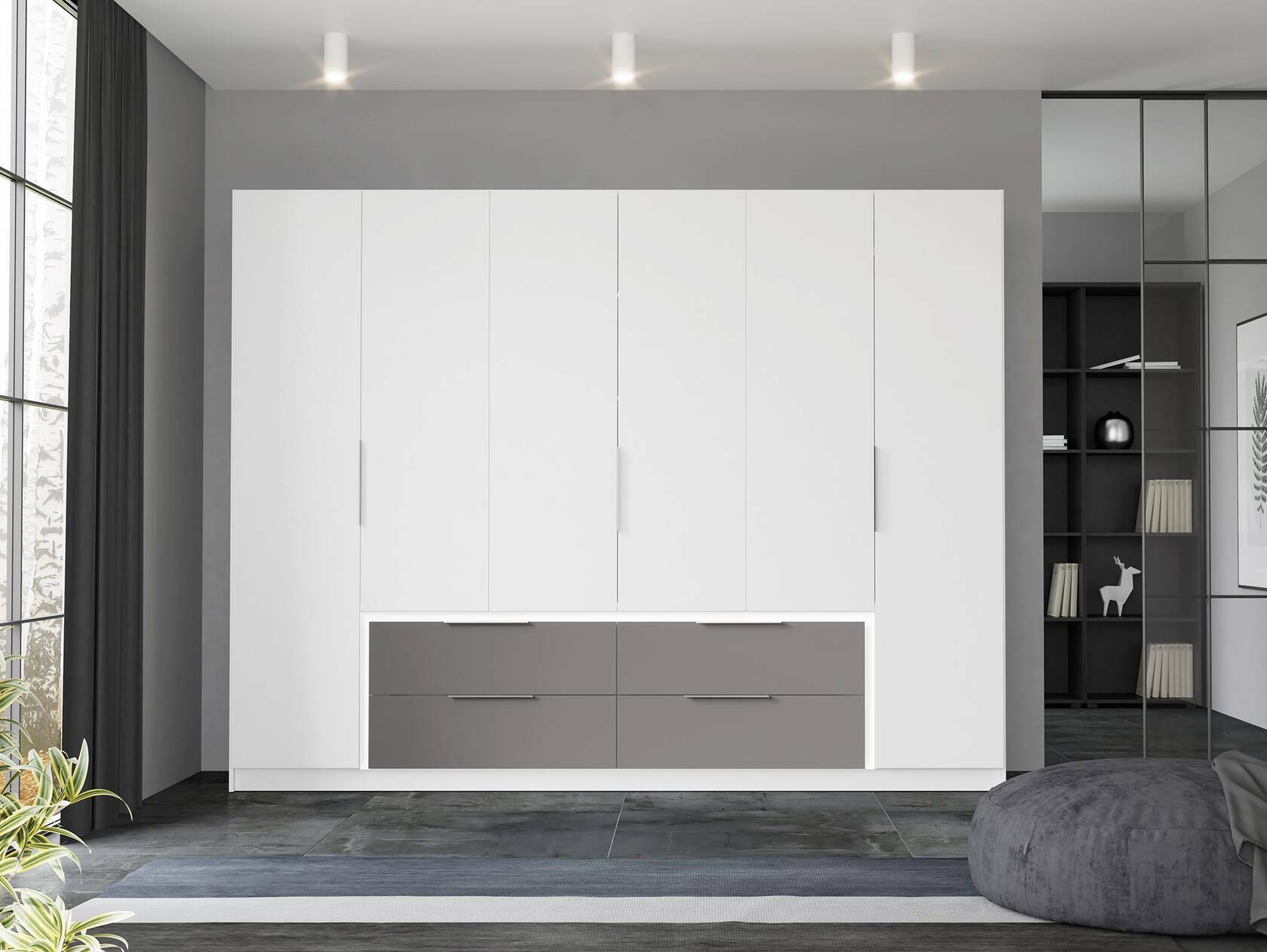 Die Türvariante des Schranks ist eine Drehtür, die sich leicht öffnen und schließen lässt. Der LURANO Drehtürenschrank ist mit 4 Schubkästen und 6 Drehtüren ausgestattet. Hinter den Drehtüren befinden sich drei Abteile: auf der rechten und linken Seite befindet sich eine Kleiderstange, während in der Mitte des Schranks drei Ablageböden Platz für weitere Gegenstände bieten.