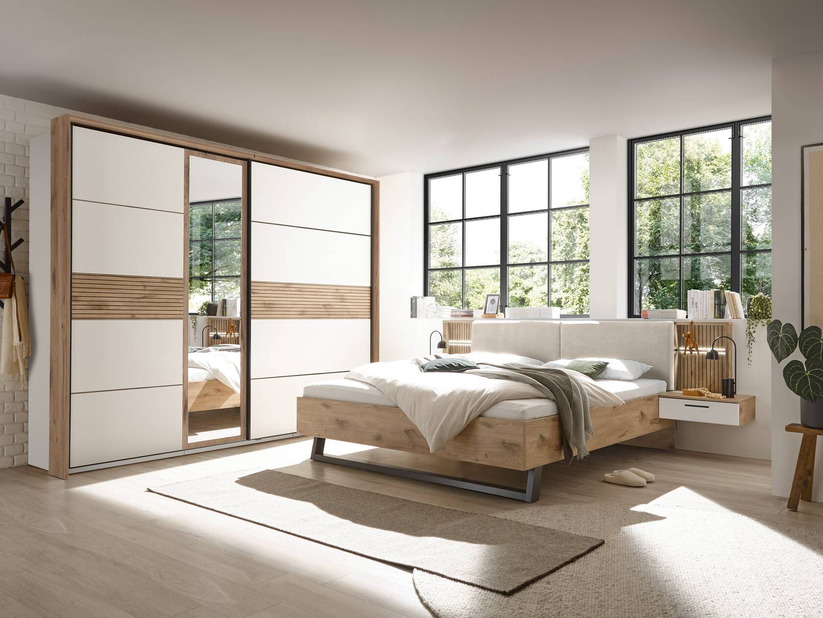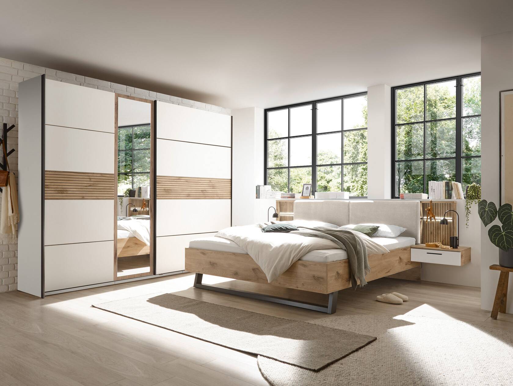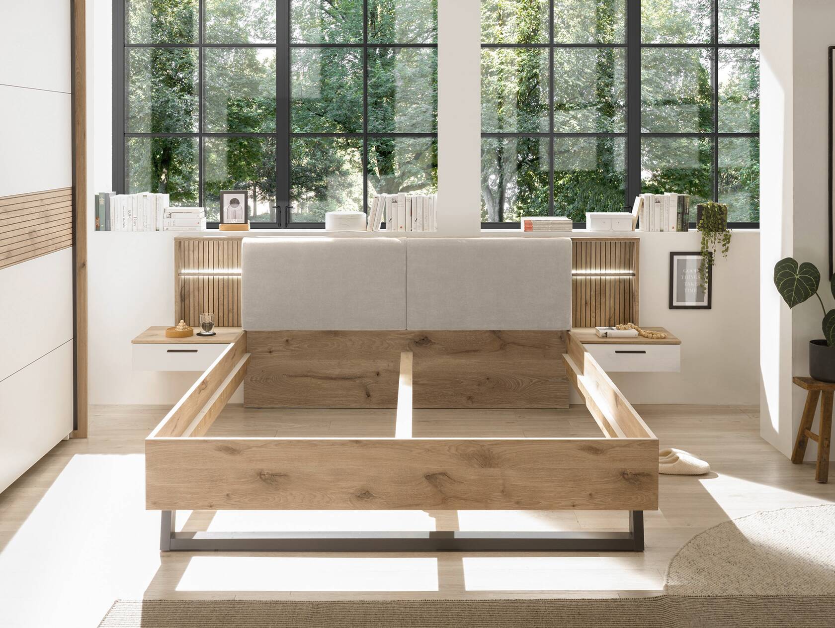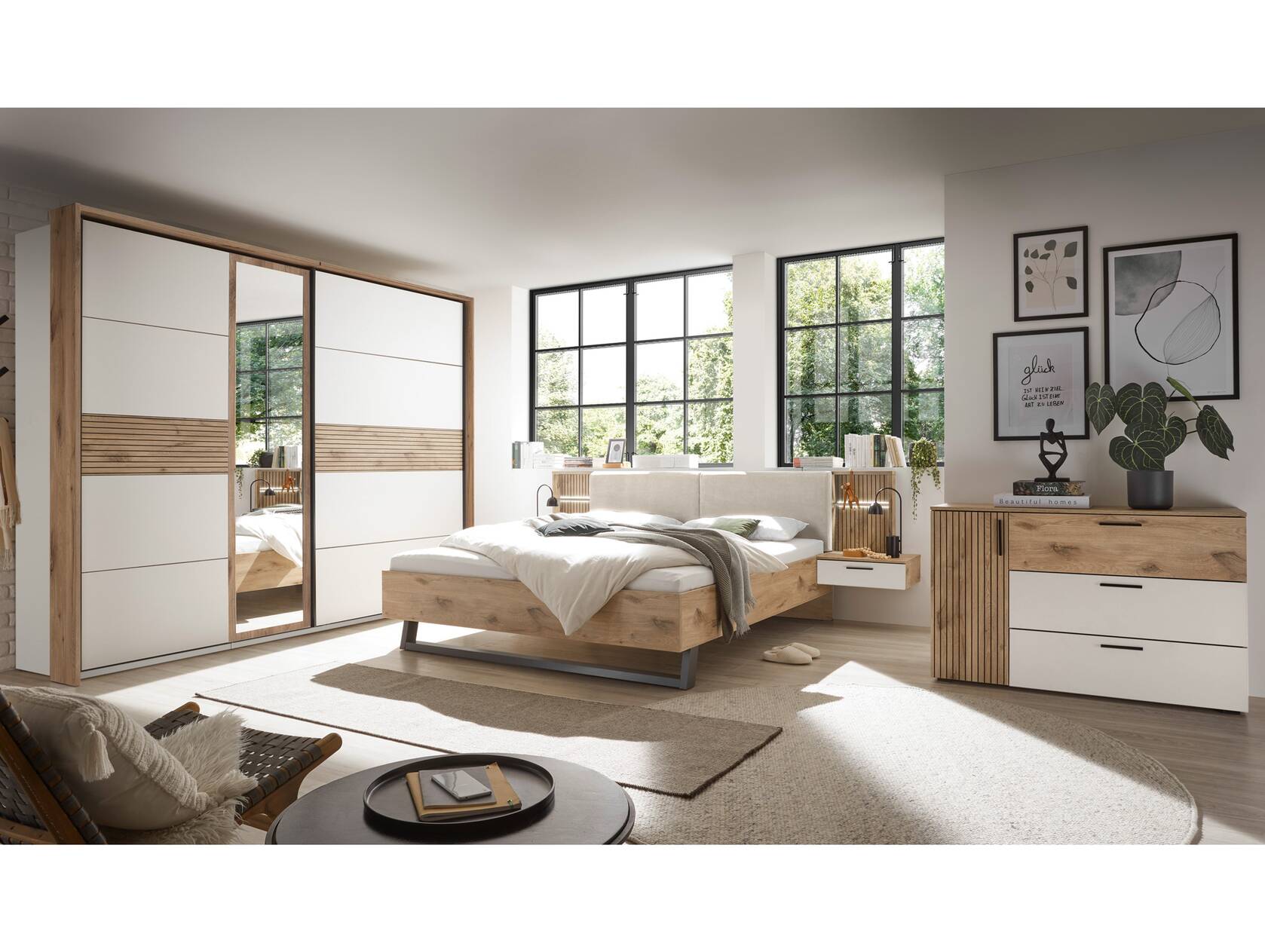 Die Nachtkommoden mit ihren praktischen Schubkästen bieten nicht nur Stauraum, sondern setzen auch stilvolle Akzente. Die Kombination aus weißem Korpus und hellen Eiche-Nachbildungen verleiht dem Raum eine moderne Note, die zeitlos und ansprechend ist.