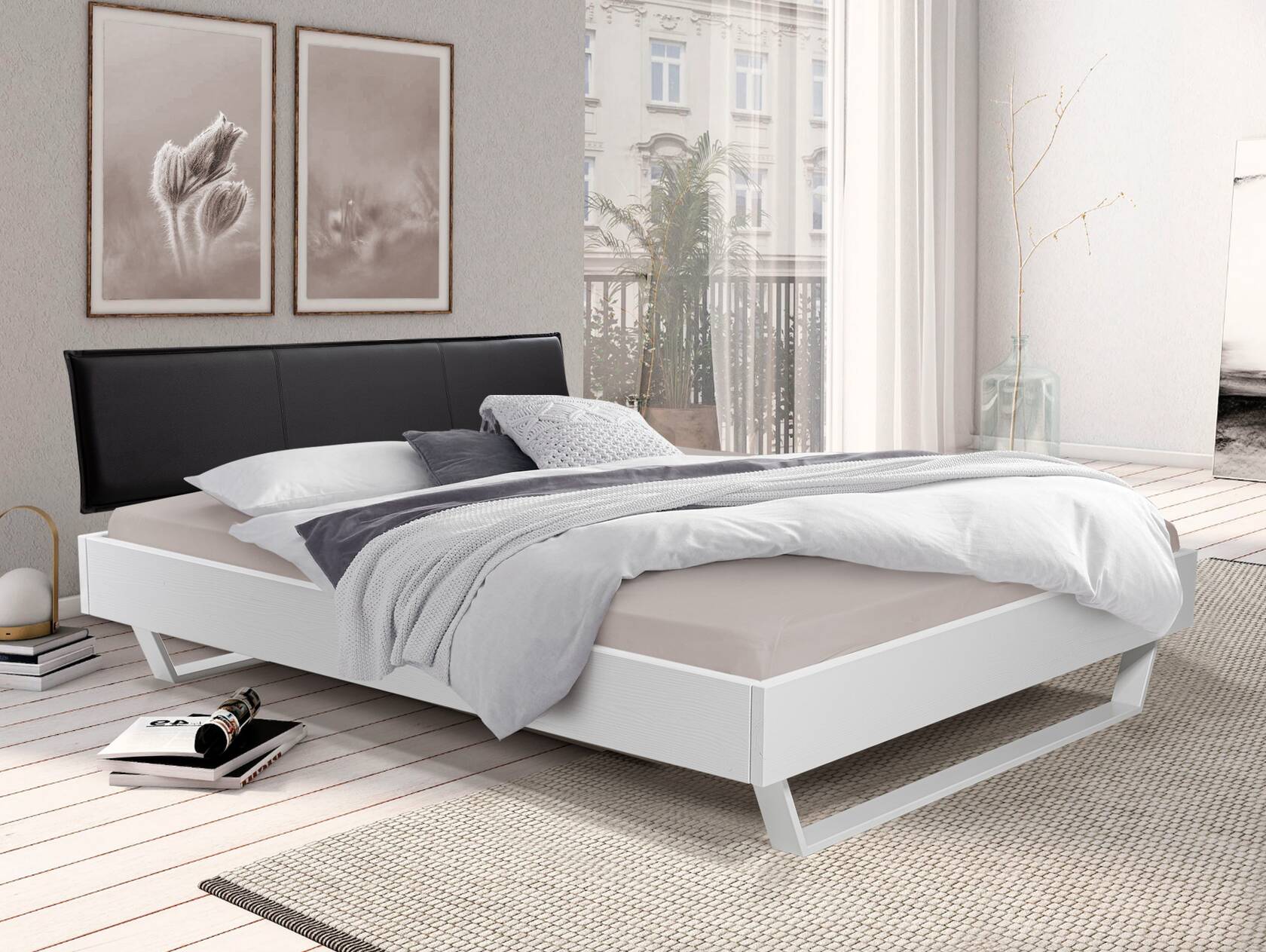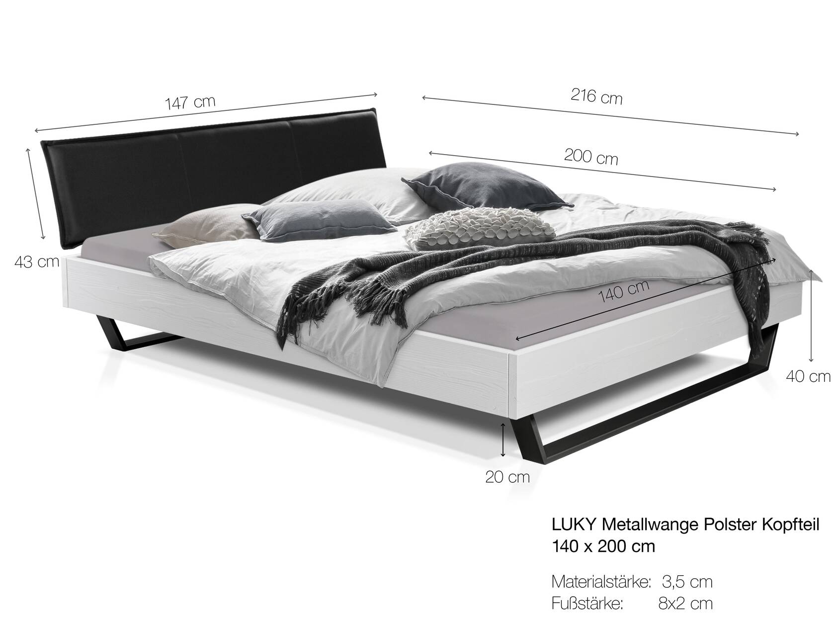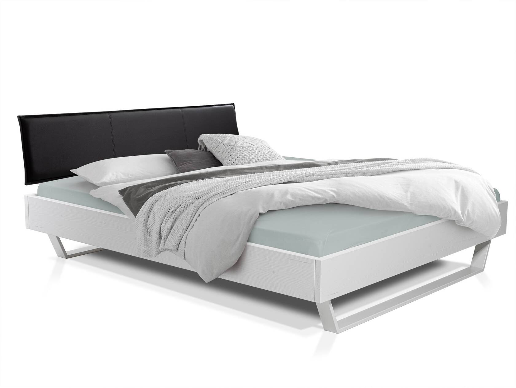 Eine tolle Kombination aus Metall, Holz und Stoff/Kunstleder ist das LUKY Kufenbett mit Polsterkopfteil aus massivem Fichtenholz. Vor allem die weißen Kufen unterstreichen den edlen Look und machen dieses Massivholzbett zu etwas ganz Besonderem. Ein gepolstertes Kopfteil sieht nicht nur schön aus, es hat auch einen praktischen Nutzen. Wenn Sie gerne im Bett lesen oder mal eine Tasse Tee genießen möchten, können Sie sich bequem anlehnen und Ihr Rücken ist weich gepolstert.
