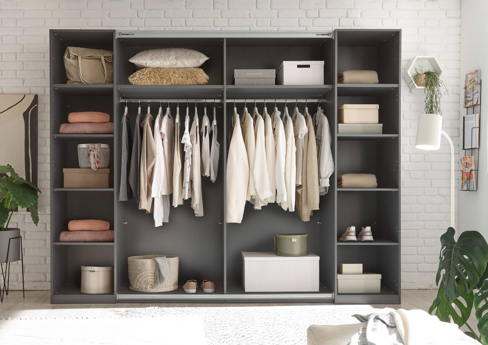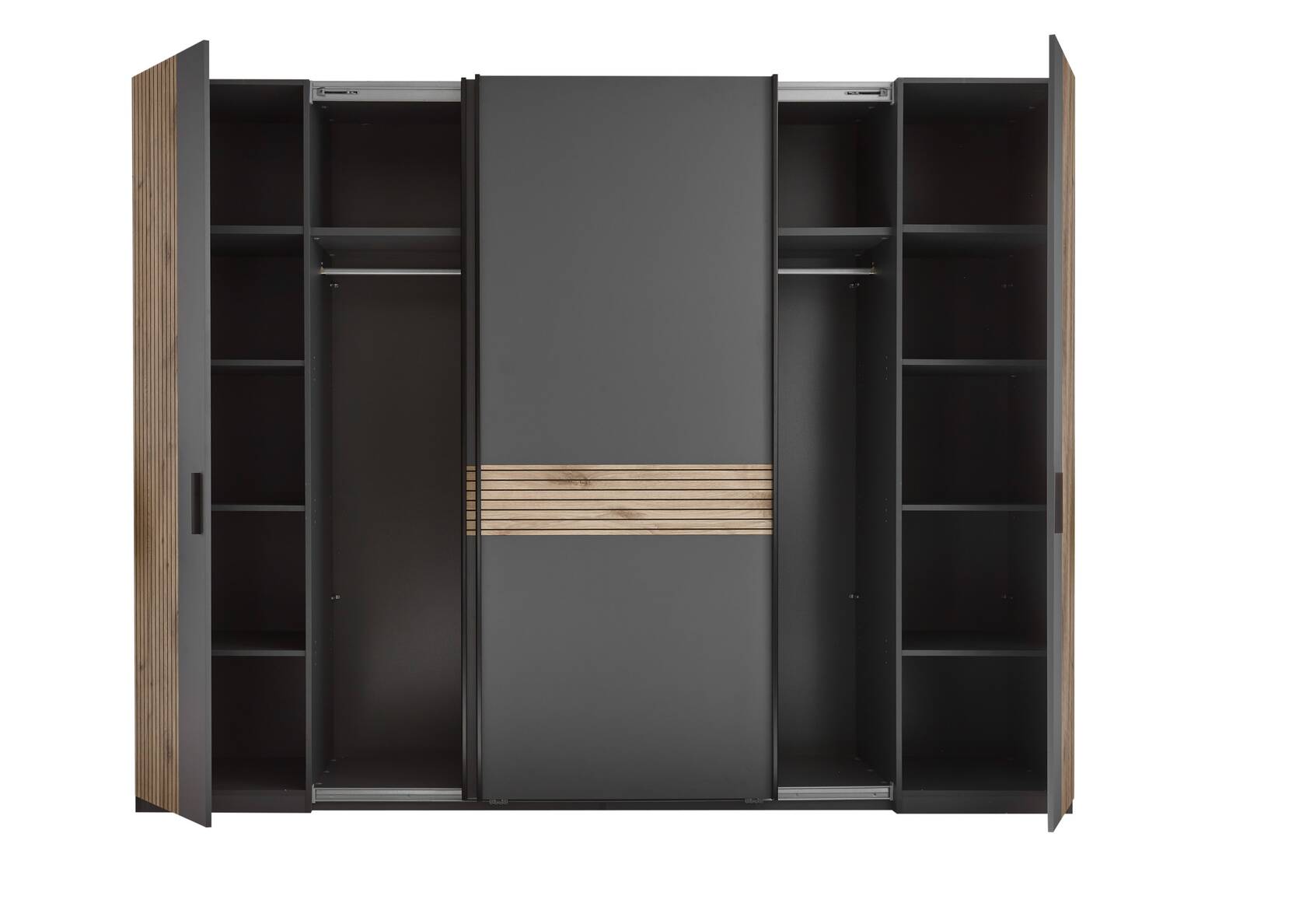 Innen 2 Schiebetüren, dahinter je 1 Boden und 1 Kleiderstange